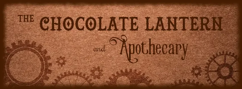 The Chocolate Lantern and Apothecary logo conveys its brand by using a dark color pallet and silhouettes of gears that convey a cozy and historical aesthetic.