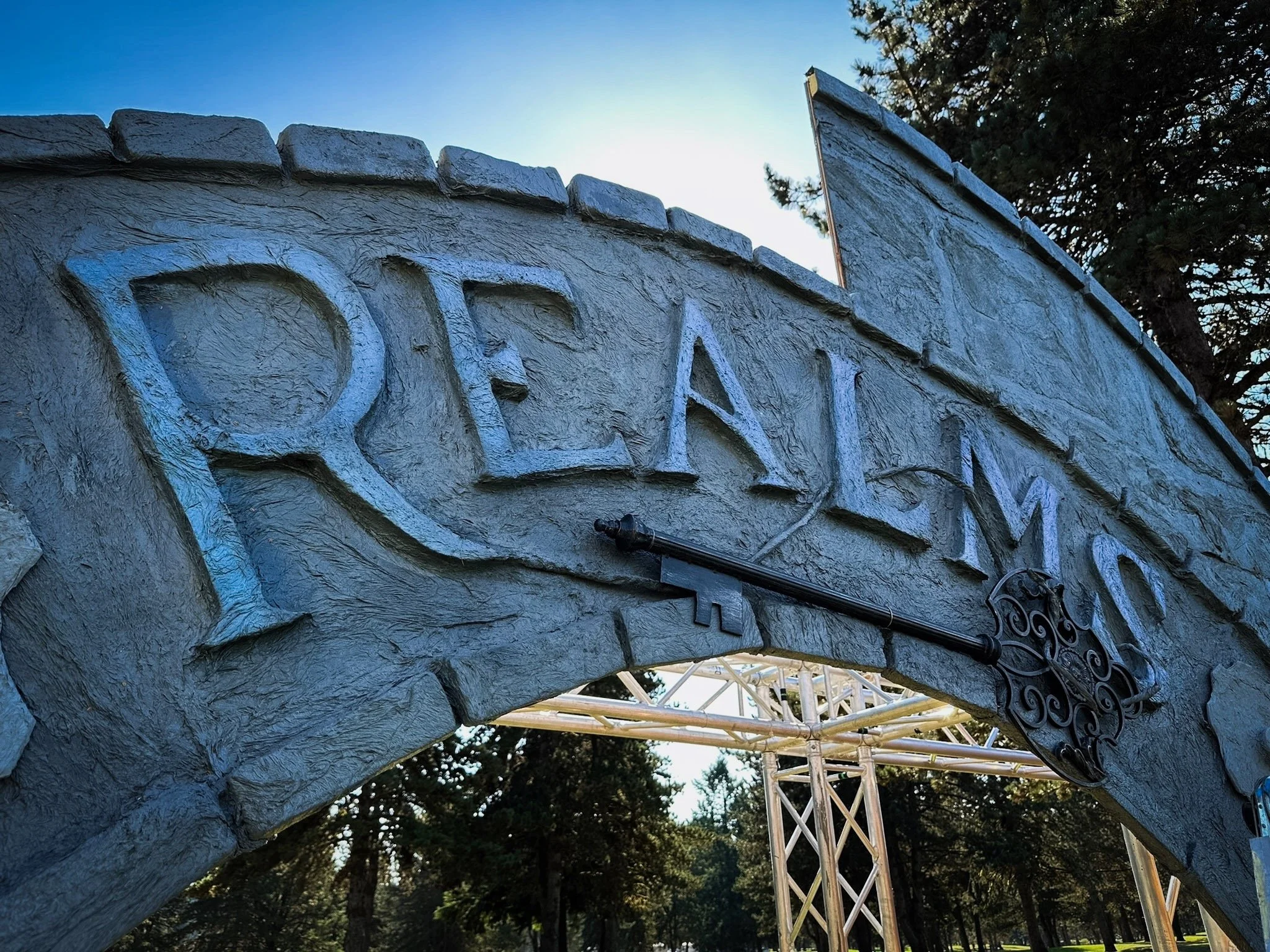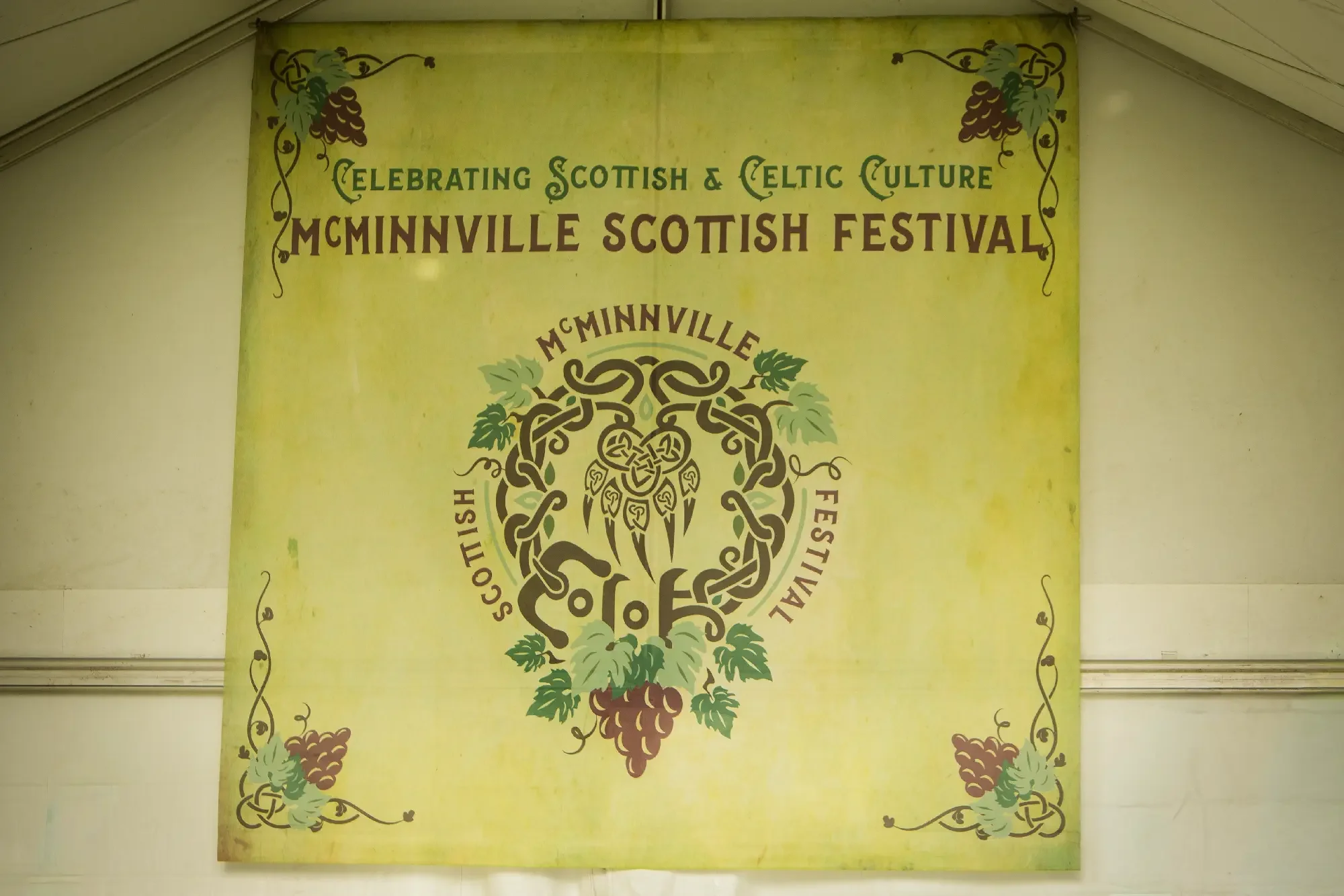 The McMinnville Scottish Festival banner at the main stage. It features several design elements that connect the festival to Scottish heritage, including Celtic knots, grapes, and an implied belt.