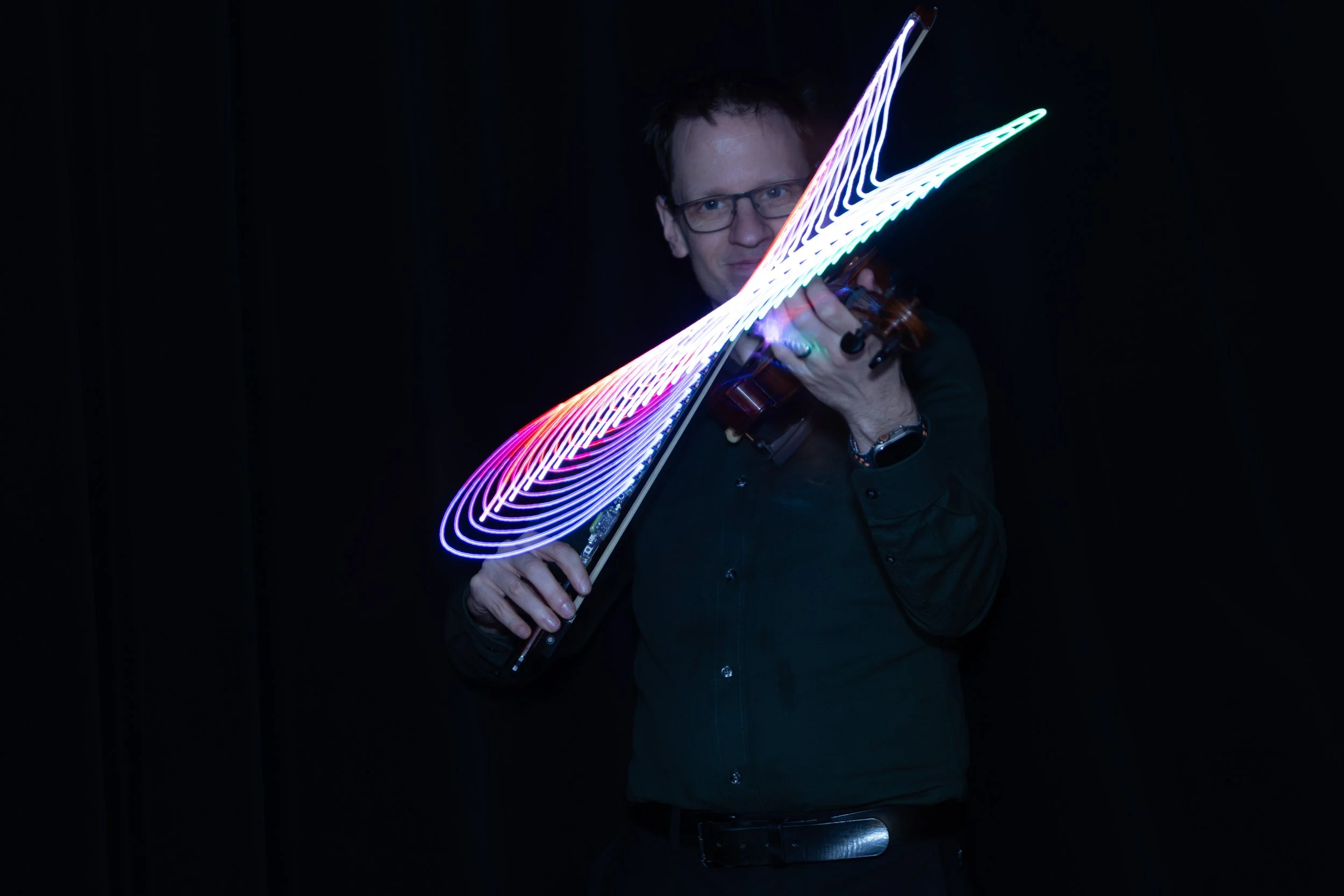 Jonathan showcasing the Glow Bow, designed and featured by Katie Jane & the Celtic Light Orchestra.